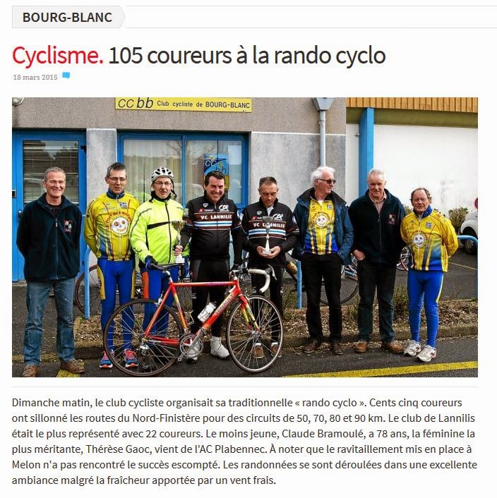 Sur la course FSGT de Plouëdern , 9 coureurs du club étaient présents. Sur la course "toute catégorie" , beau tir groupé du club puisque Laurent prend la 4ème place, Arnaud B la 5ème, Philippe la 6ème et Matthieu la 7ème en étant également classé 2ème meilleur animateur. On pourra noter leur belle course d'équipe. Dommage qu'elle ne fut pas récompenser par un prix !